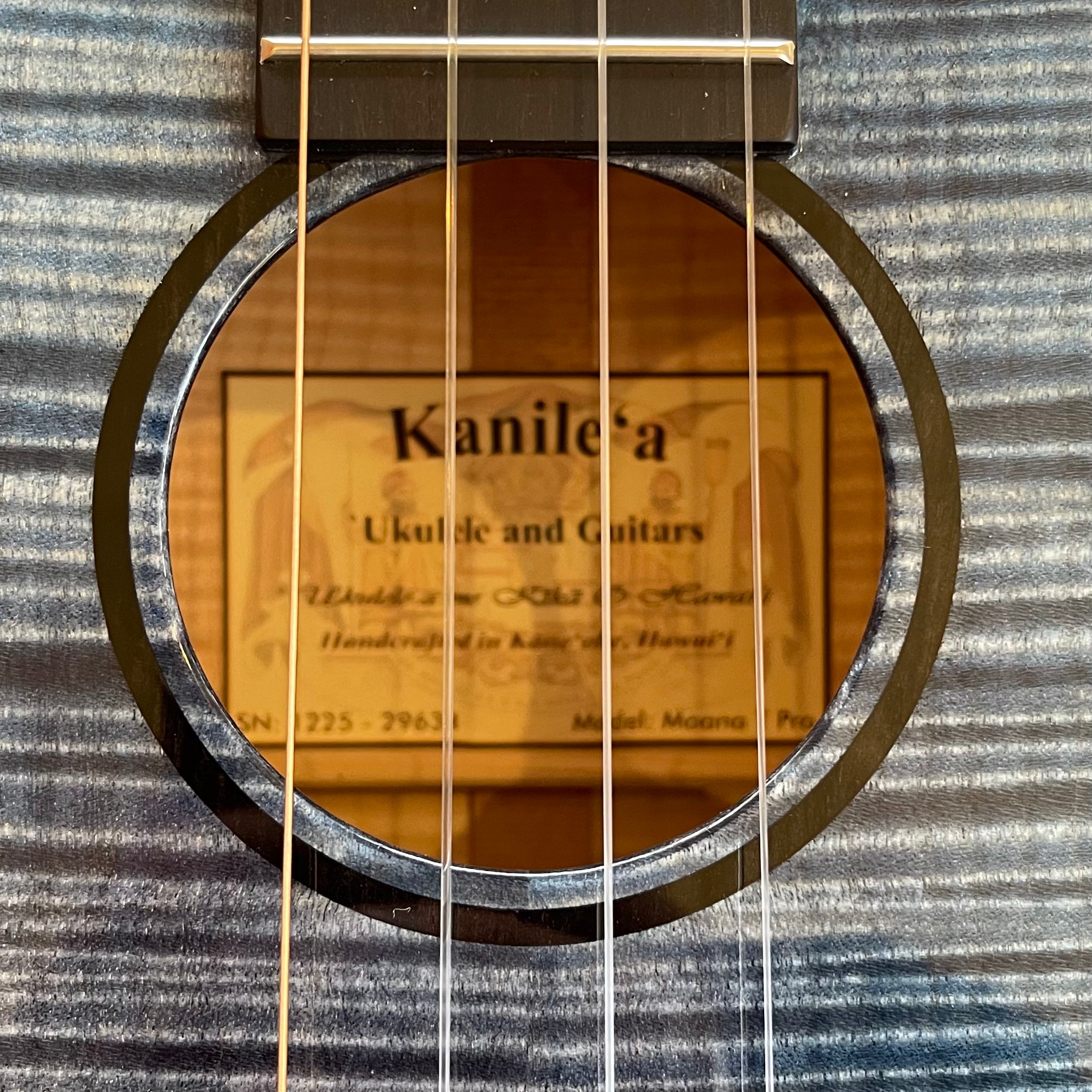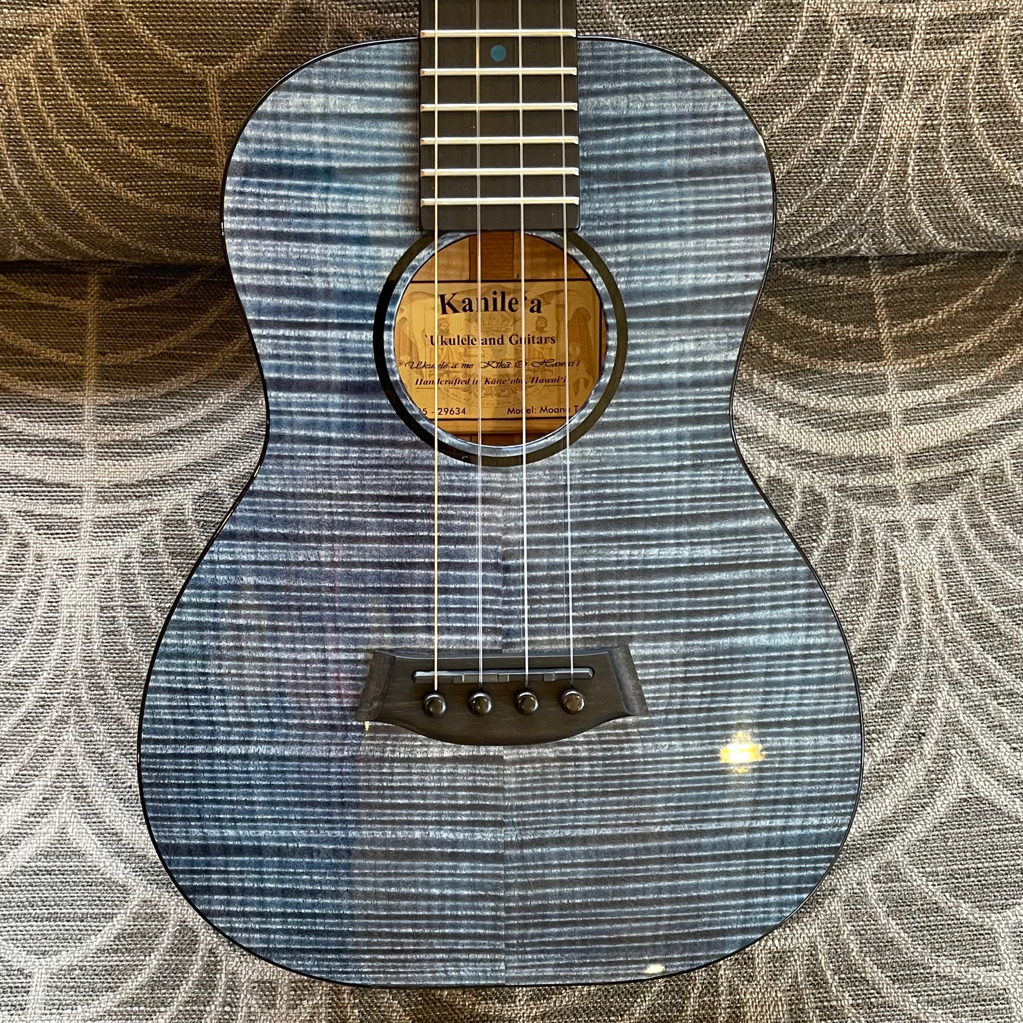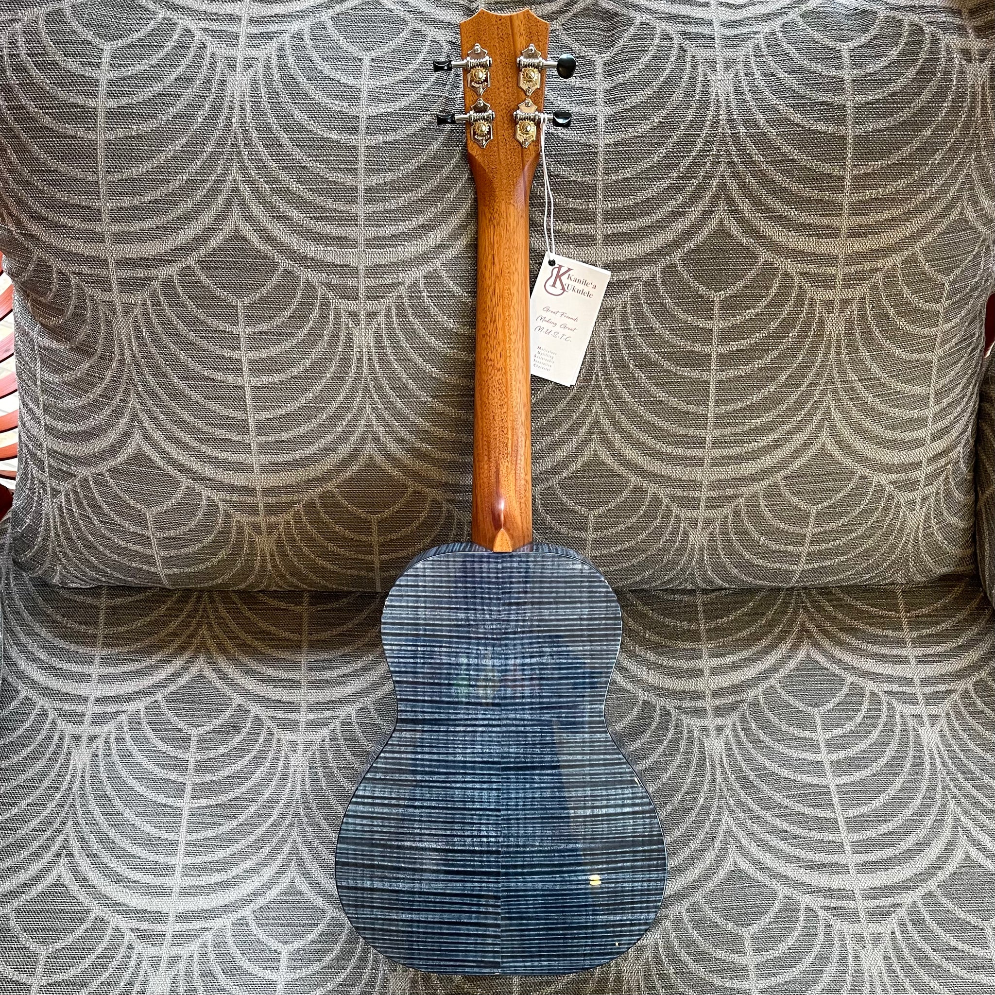 Introducing the beautiful Kanileʻa Moana (Beach) Tenor ukulele! This is a prototype model, the very first Kanile'a Moana model made and the only available Moana model anywhere. This ukulele is made out of a top, back and sides of solid curly maple and dyed by the Kanile'a Souza brothers, Kaimana and Kahiau, to look like the beautiful Pacific Ocean that surrounds the islands. The Moana features a unique blue Kanile'a logo and blue poplar fret markers as well as a wound low-G. It features a unique ebony folk guitar style tweezer bridge with a graphite infused saddle for increased resonance and string health as well as a side sound port to help any performer feel the resonance of the instrument. Comes equipped with Kanileʻa original geared tuners and a high UV gloss finish on the body. Kanile'a ukuleles are known for producing a sweet tone and a well balanced resonance across all frequencies due to their Tru-redesign bracing system. The Pohaku also has the TRU-Resonance engraving under the soundboard to increase resonance. Comes with Kanile'a original carrying bag.