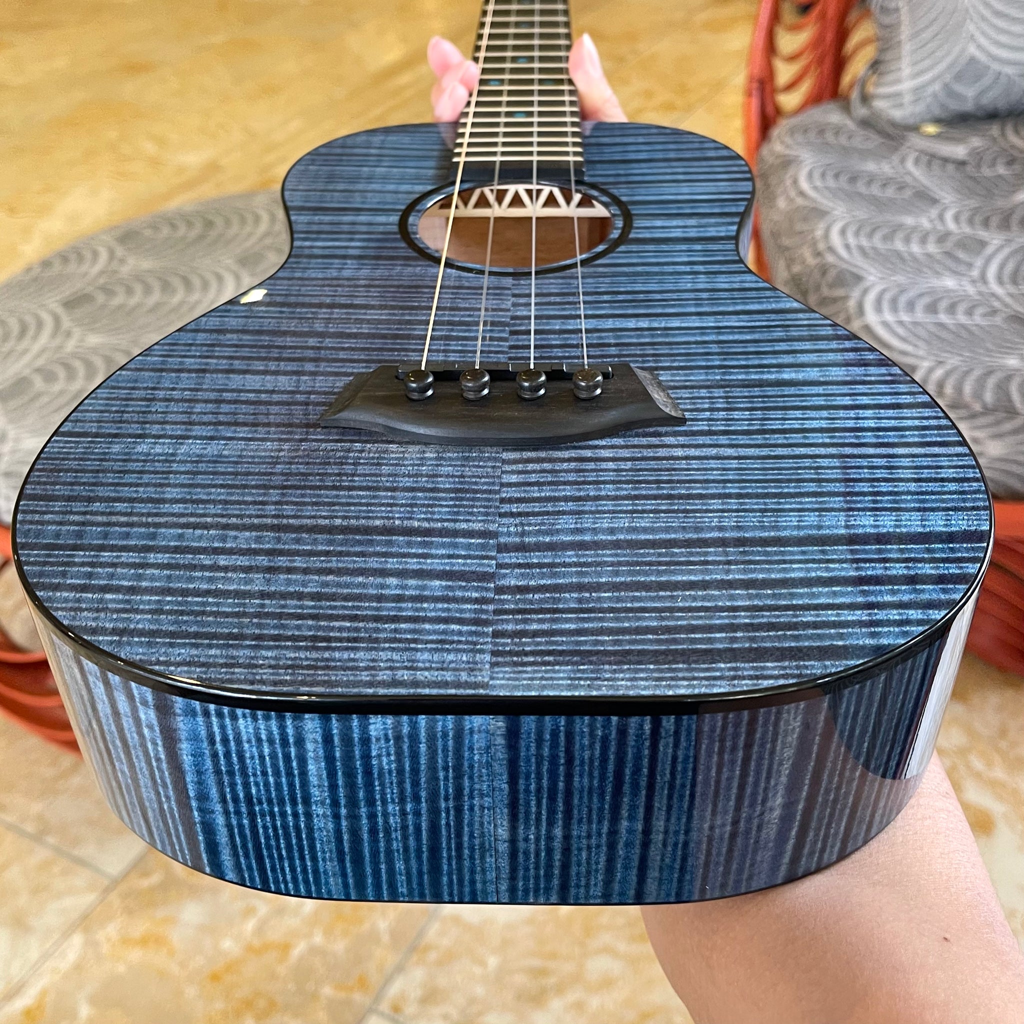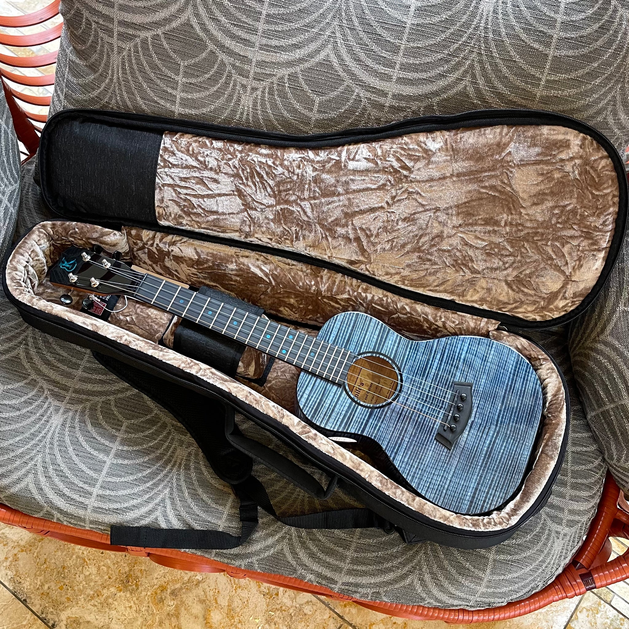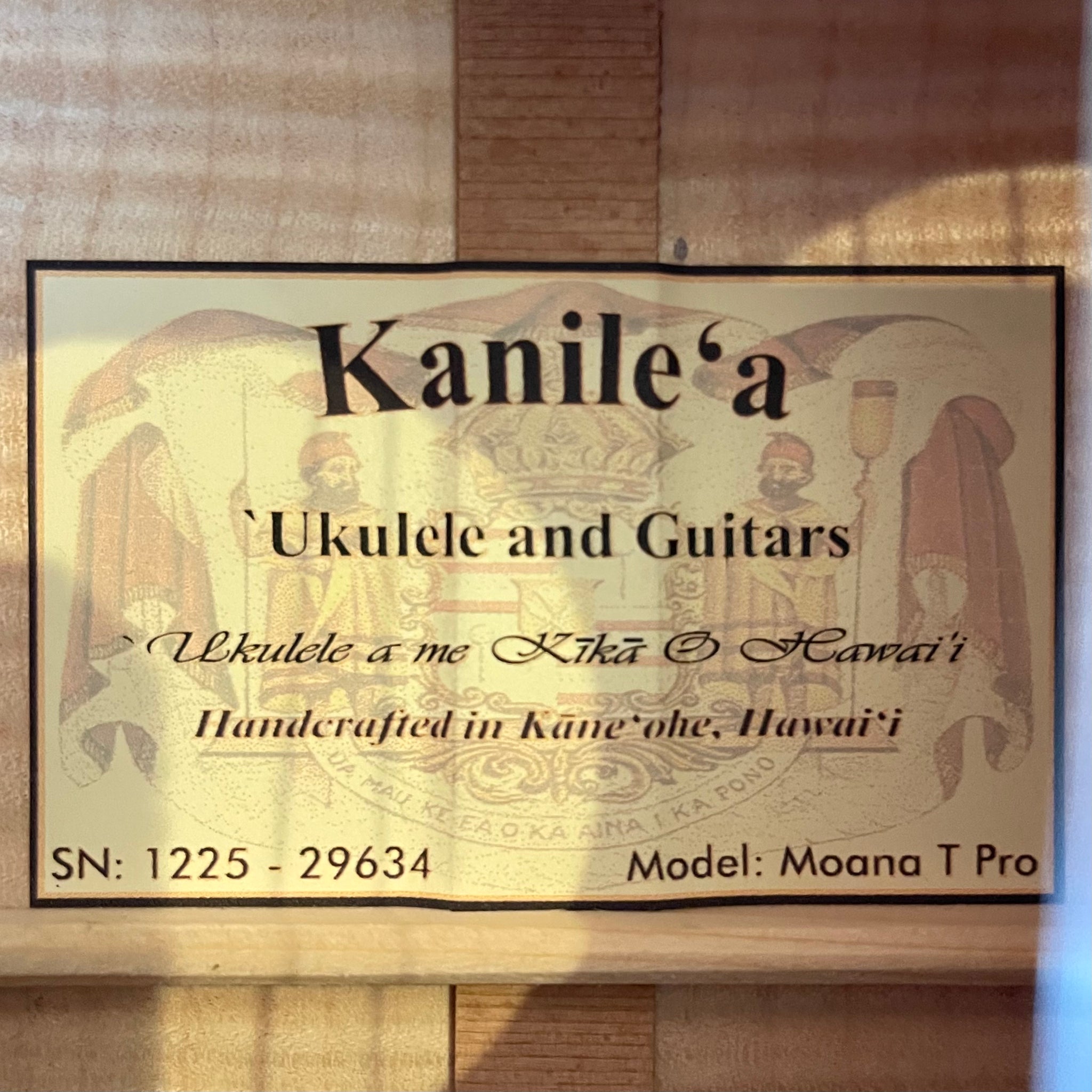Introducing the beautiful Kanileʻa Moana (Beach) Tenor ukulele! This is a prototype model, the very first Kanile'a Moana model made and the only available Moana model anywhere. This ukulele is made out of a top, back and sides of solid curly maple and dyed by the Kanile'a Souza brothers, Kaimana and Kahiau, to look like the beautiful Pacific Ocean that surrounds the islands. The Moana features a unique blue Kanile'a logo and blue poplar fret markers as well as a wound low-G. It features a unique ebony folk guitar style tweezer bridge with a graphite infused saddle for increased resonance and string health as well as a side sound port to help any performer feel the resonance of the instrument. Comes equipped with Kanileʻa original geared tuners and a high UV gloss finish on the body. Kanile'a ukuleles are known for producing a sweet tone and a well balanced resonance across all frequencies due to their Tru-redesign bracing system. The Pohaku also has the TRU-Resonance engraving under the soundboard to increase resonance. Comes with Kanile'a original carrying bag.
