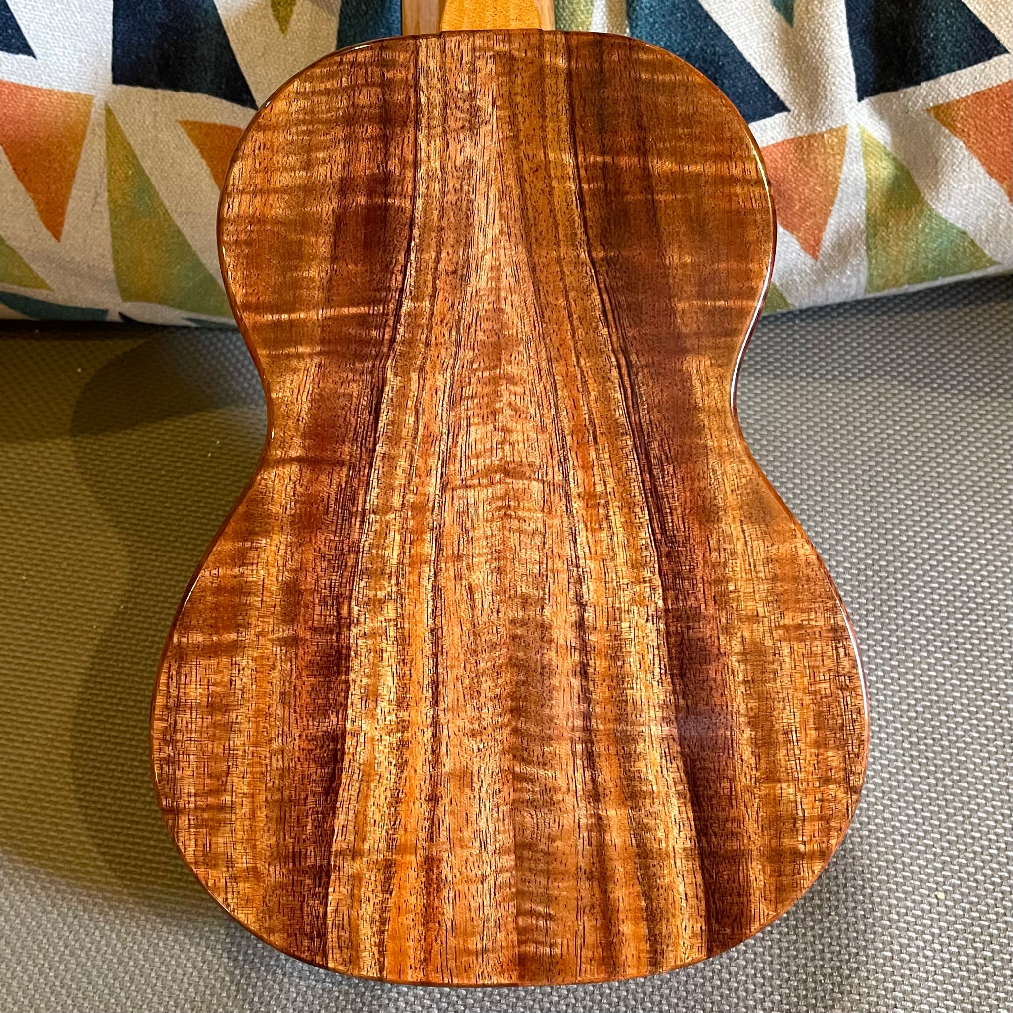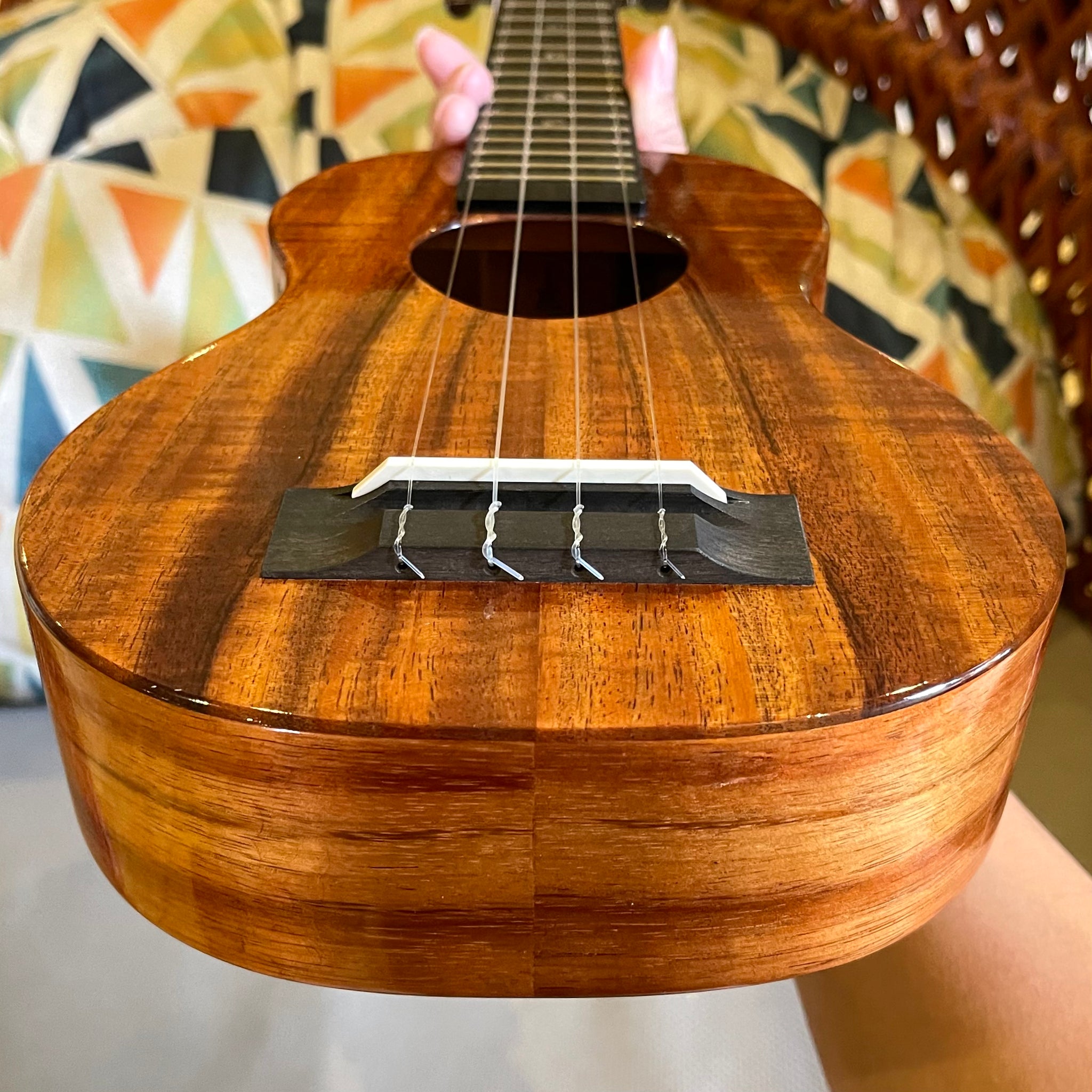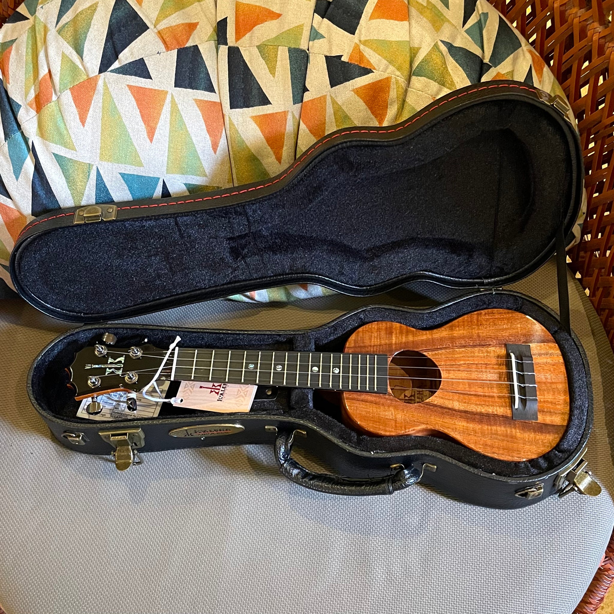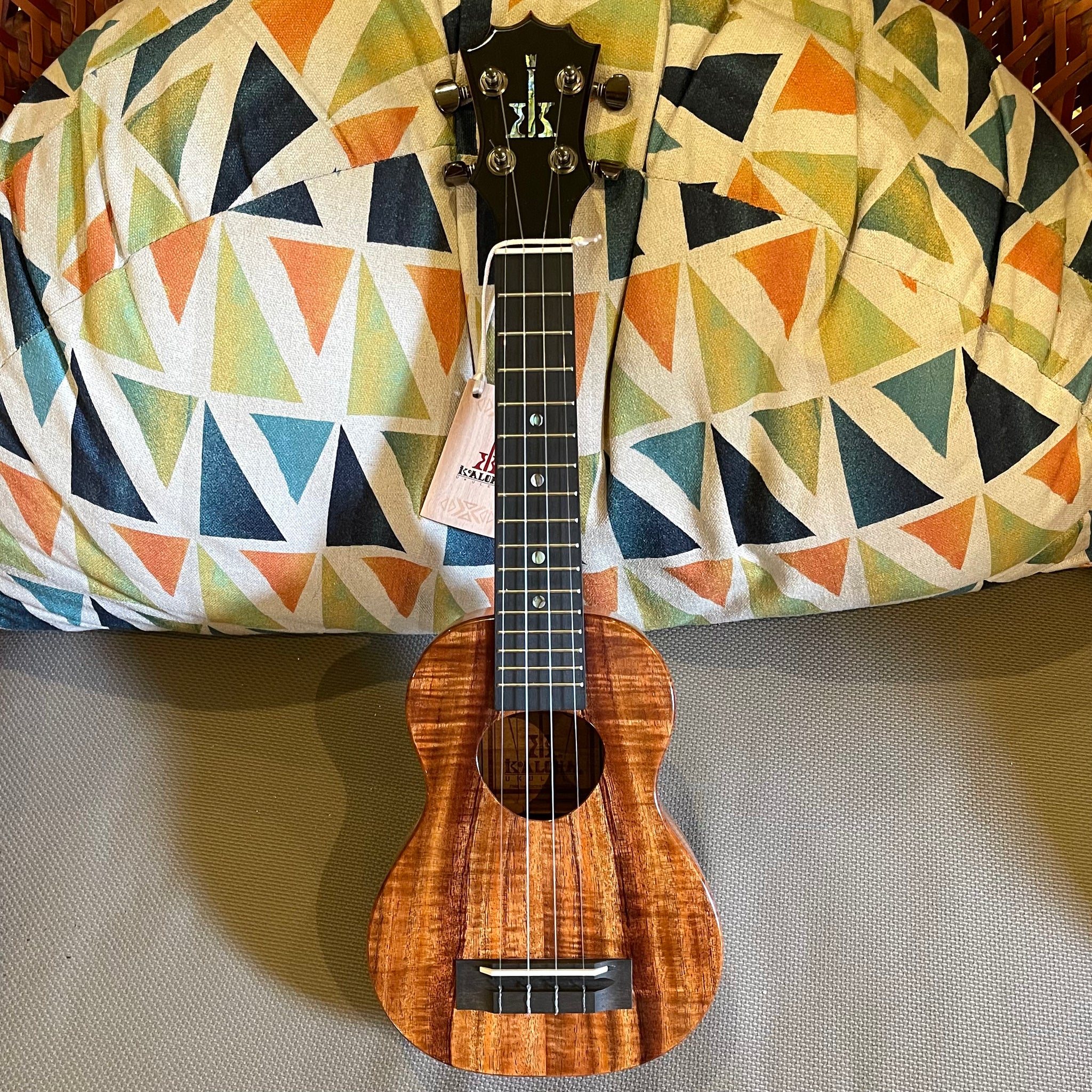 The KoAloha KSM-00 Soprano Ukulele is a soprano ukulele which has a solid Hawaiian koa body. This ukulele features the KoAloha signature five point crown shaped headstock and musubi shaped sound hole. It comes equipped with KoAloha's original geared tuner, is very lightweight, and well balanced, making it easy to hold and play. This ukulele is popular with many beginners who want a Hawaii made ukulele because of its user friendly design and its loud, bright tone.