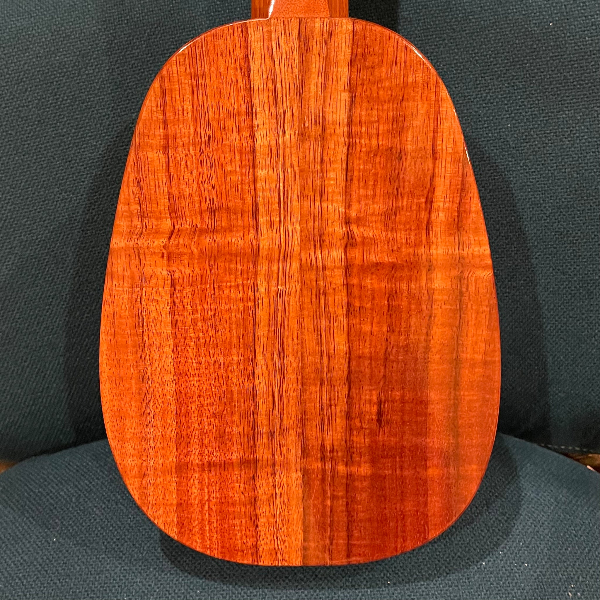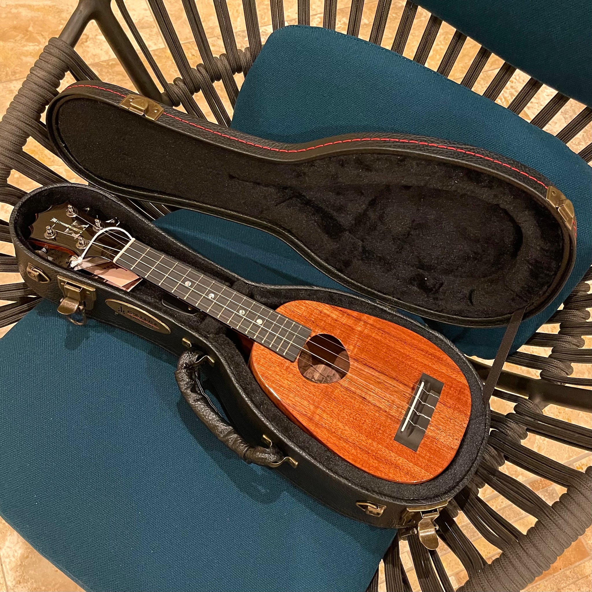 The KoAloha KSM-01 Soprano Pineapple Ukulele is a soprano ukulele which has a solid Hawaiian koa body in the pineapple shape. This ukulele features the KoAloha signature five point crown shaped headstock with an ebony face plate and musubi shaped sound hole. It comes equipped with KoAloha's original geared tuner, is very lightweight, and well balanced, making it easy to hold and play. This ukulele is popular with many beginners who want a Hawaii made ukulele because of its user friendly design and its loud, bright tone.