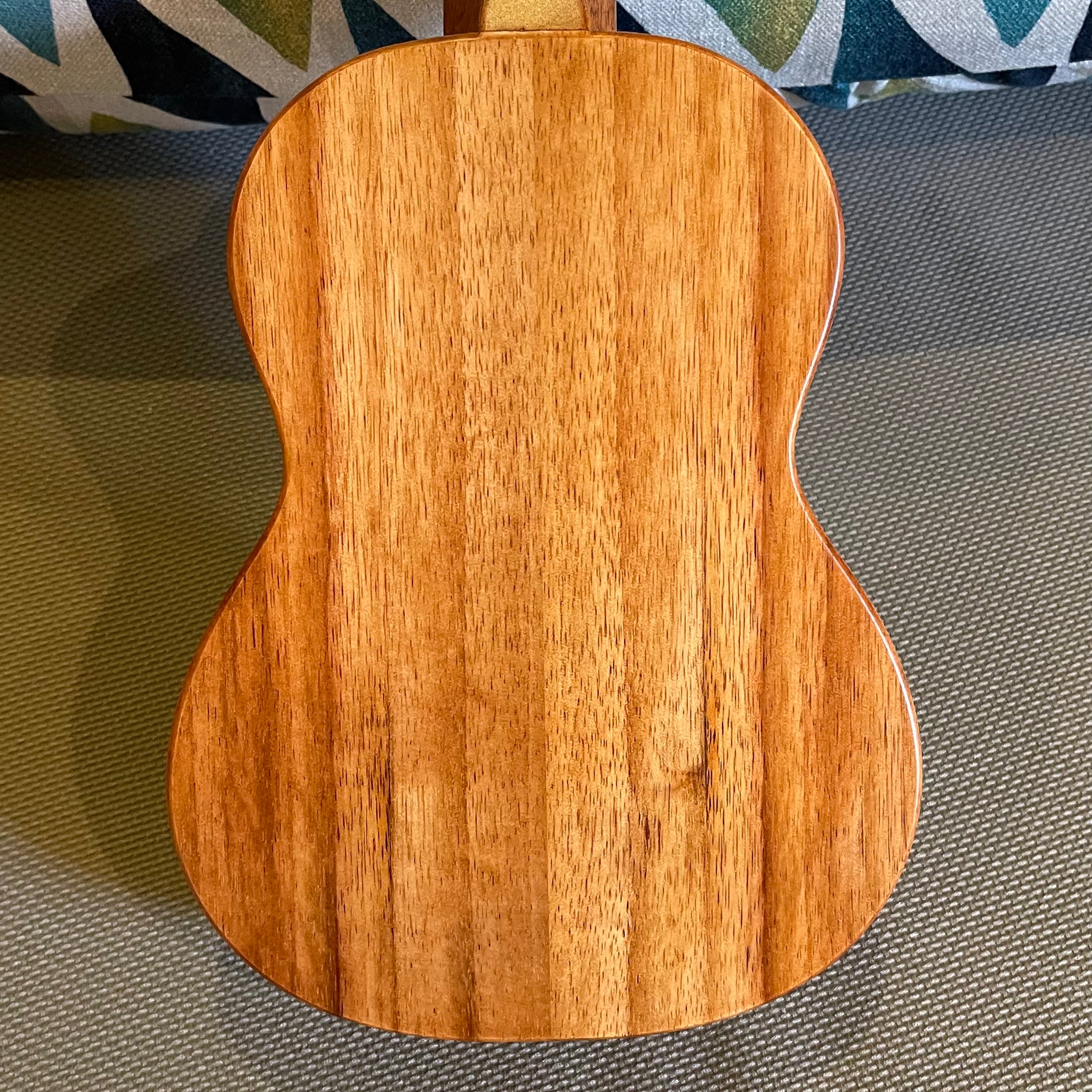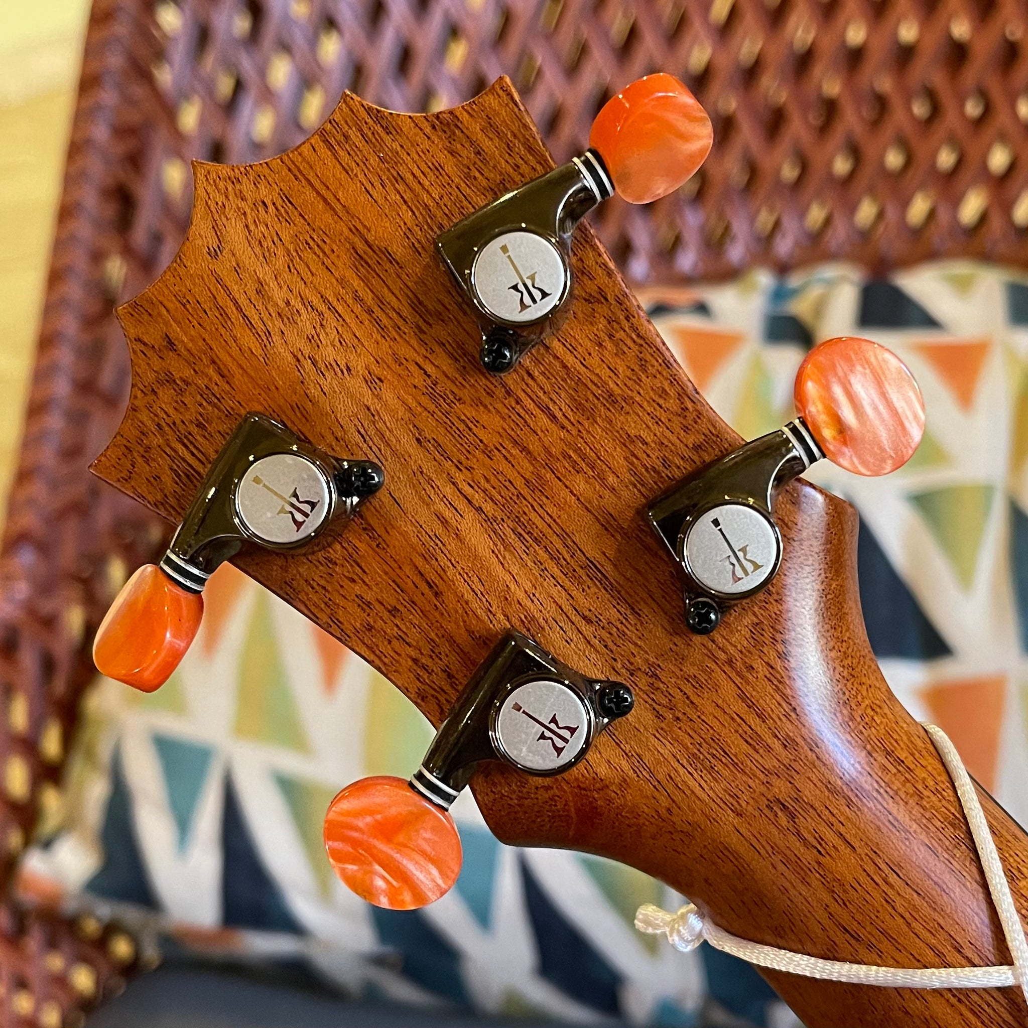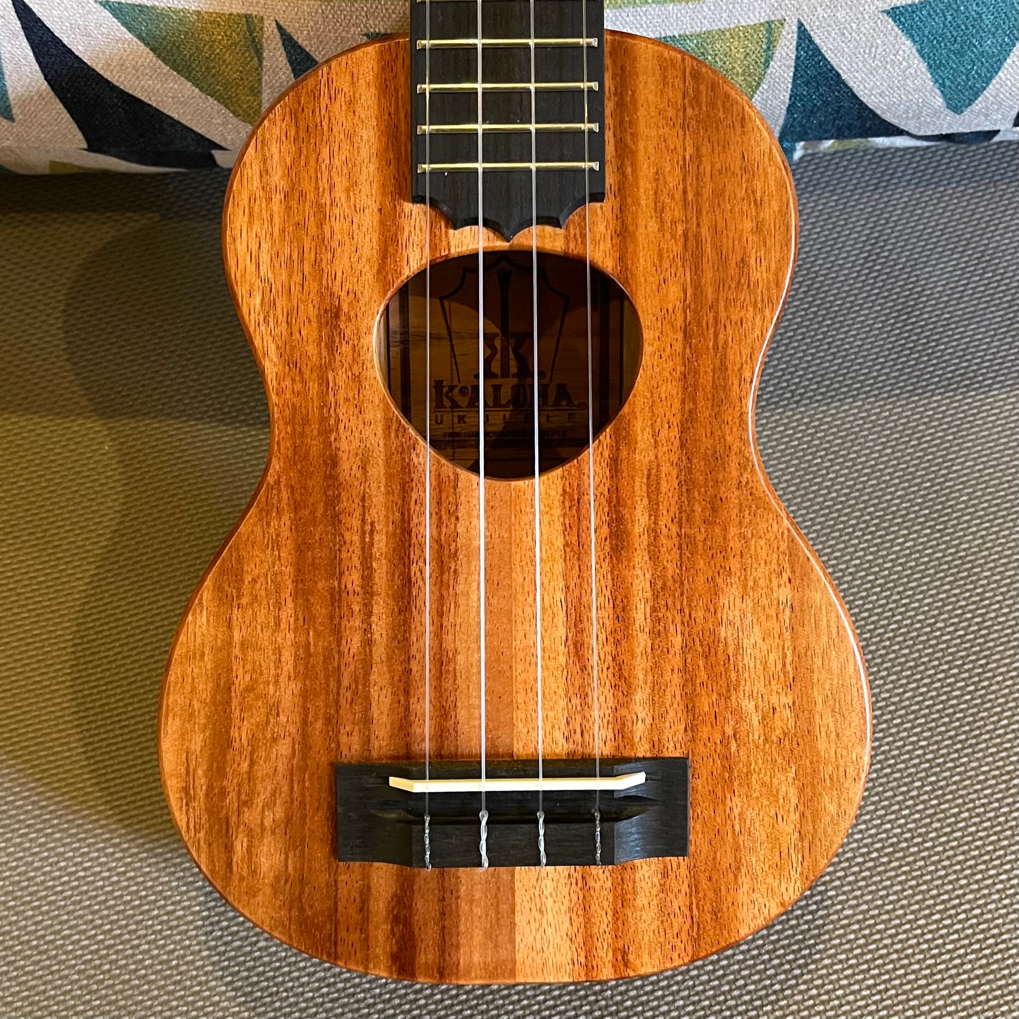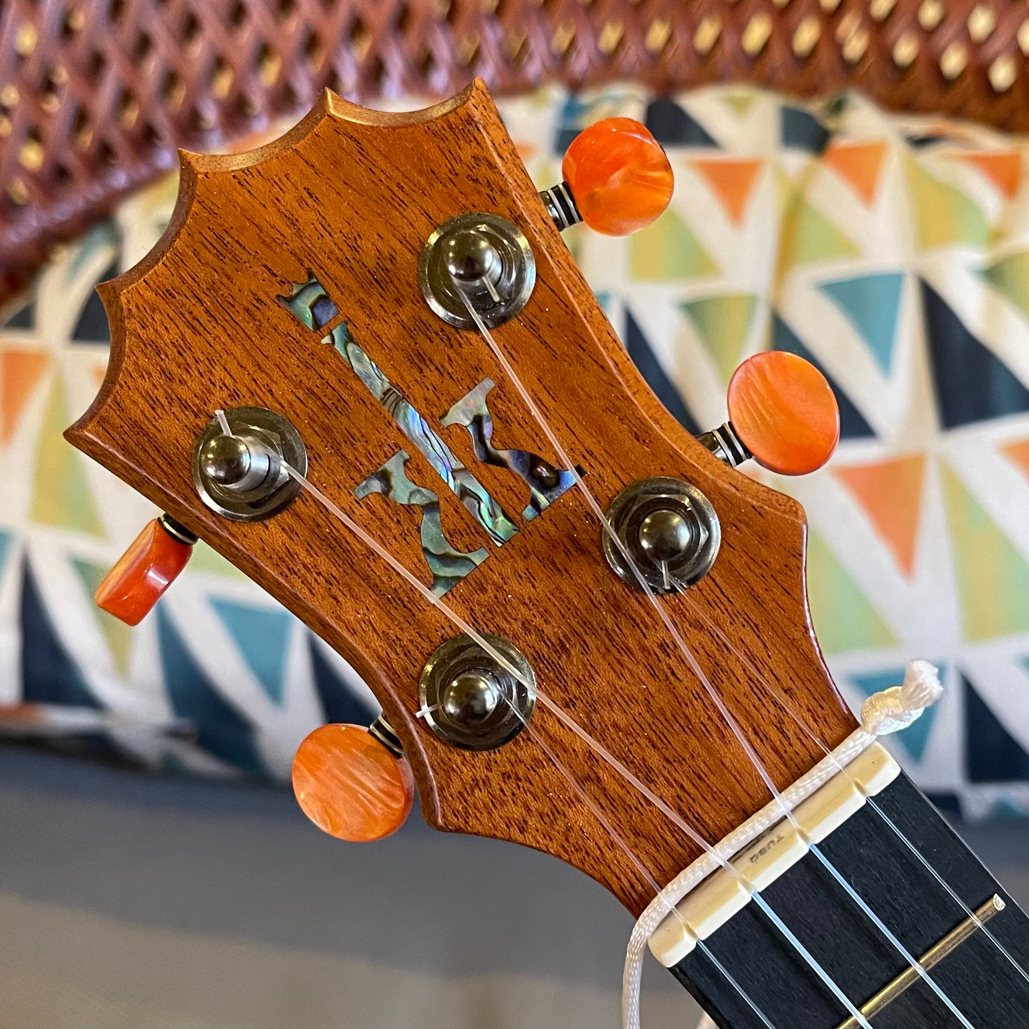 The KoAloha KSM-12 is a soprano long neck ukulele with a concert sized neck. The body is made of Hawaiian koa with a satin finish. This ukulele features the KoAloha signature five point crown shaped headstock with an abalone KoAloha logo and the musubi shaped sound hole.It comes equipped with KoAloha's original geared tuner. Tone is bright and loud.